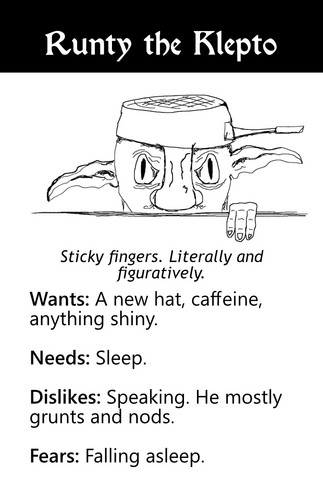- Runty. A tepid goblin kleptomaniac wanting a nicer hat.